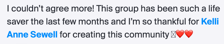 Monthly community events with Kelli (both virtual and IRL)! Including dinners, parties, happy hours, workout classes, etc.!
